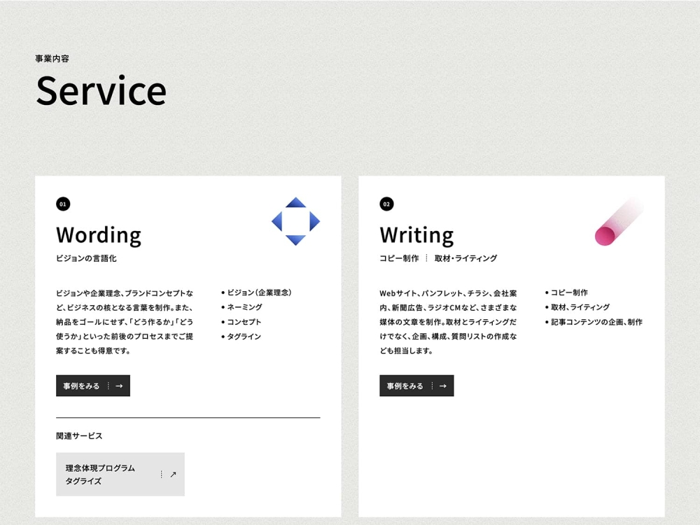 デザインに関する横田氏のご要望は、「ザツダンはコンサルティング会社とデザイン会社の中間の受け皿になりたい。言葉だけではなくグラフィカルな雰囲気のあるデザインにしてほしい」「言語化カンパニーはこれまでにない新しい事業なので、研究所感=アカデミック感がほしい」とのことでした。それらのご要望を受けて、Web サイトのデザインは図形を用いた抽象的なグラフィックをモチーフにすることで、研究所感=アカデミック感を演出。またミッションとして掲げた「言葉と進め」という言葉が持つ「力強さ」と「推進力」を、三角形のグラフィックとしてメインビジュアルに落とし込みました。実績紹介では、事業で制作した言葉をカルタのように見せるレイアウトを採用。旧サイトから見せ方を引き継ぎつつも、細部をブラッシュアップしました。